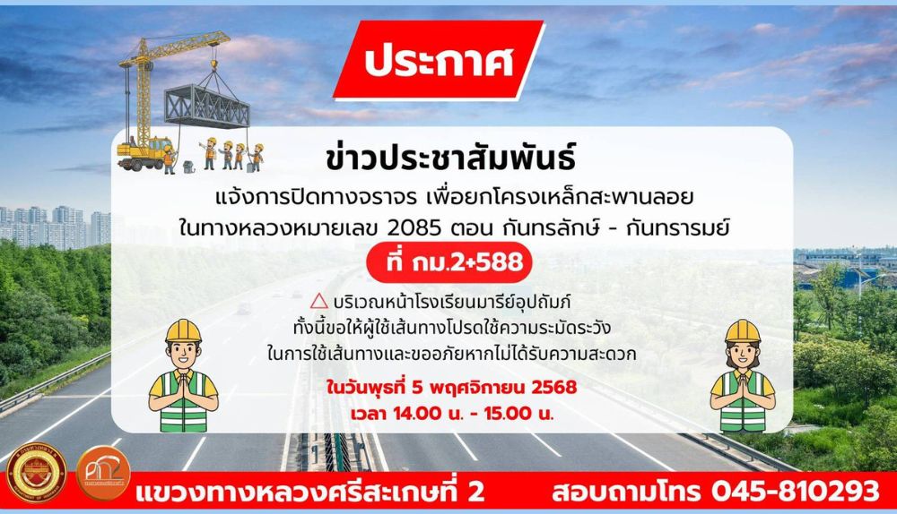 แจ้งการปิดทางจราจร เพื่อยกโครงเหล็กสะพานลอยในทางหลวงหมายเลข 2085 บริเวณหน้าโรงเรียนมารีย์อุปถัมภ์