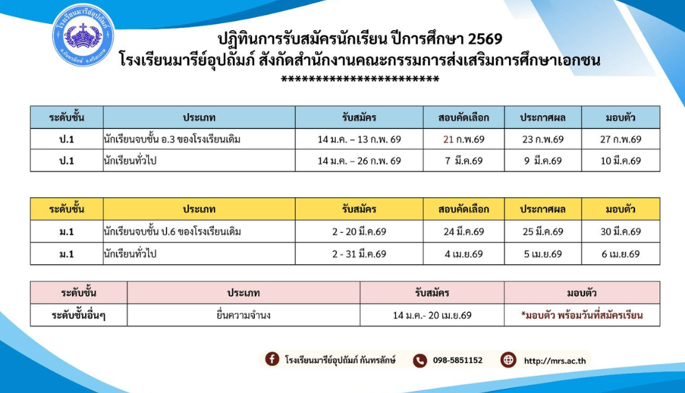 โรงเรียนมารีย์อุปถัมภ์ เปิดรับสมัครนักเรียนใหม่ ประจำปีการศึกษา 2569 รายละเอียด สามารถดูเพิ่มเติมได้ ด้านล่างนี้